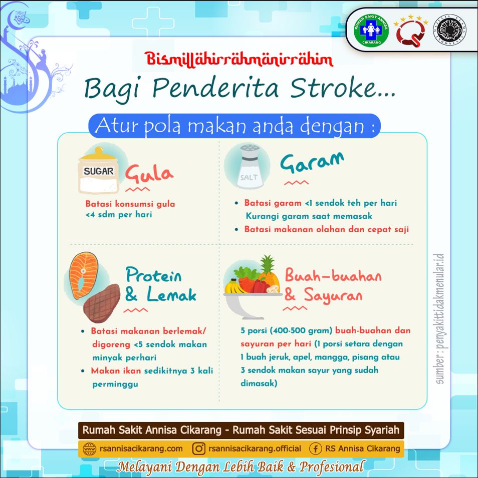 RS Annisa//- Rumah Sakit di Cikarang yang juga sebagai Rumah Sakit Syariah. adalah Tempat perawatan kesehatan yang mengintegrasikan nilai-nilai Islam dalam setiap aspek pelayanan. Kami berkomitmen melayani dengan lebih baik dan profesional. Kesehatan itu sangat penting berikut kami sampaikan materi kesehatan berkaitan dengan Pola Makan Sehat Bagi Penderita Stroke.