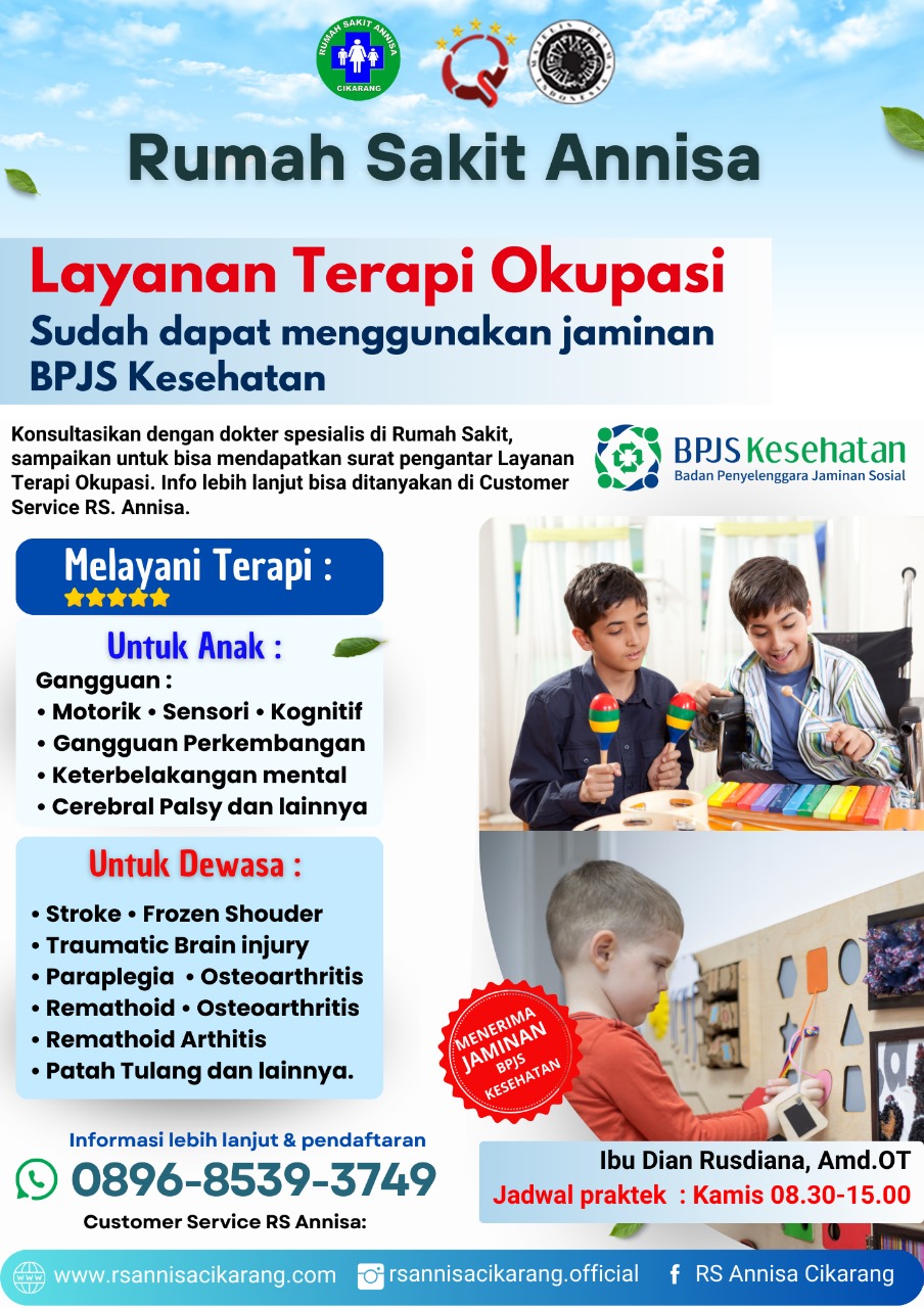 RS Annisa//- Rumah Sakit di Cikarang yang juga sebagai Rumah Sakit Syariah. adalah Tempat perawatan kesehatan yang mengintegrasikan nilai-nilai Islam dalam setiap aspek pelayanan. Kami berkomitmen melayani dengan lebih baik dan profesional. Kesehatan itu sangat penting berikut kami sampaikan materi kesehatan berkaitan dengan Terapi Okupasi.