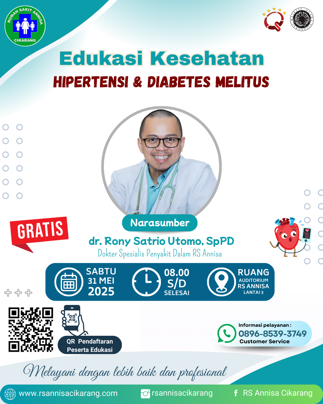 RS. Annisa Cikarang mengundang Anda untuk hadir dalam Edukasi Kesehatan Hipertensi dan Diabetes, yang akan diselenggarakan pada Sabtu, 31 Mei 2025. Acara ini bertujuan untuk meningkatkan pemahaman masyarakat tentang pencegahan dan pengelolaan penyakit hipertensi serta diabetes, yang merupakan dua kondisi kesehatan paling umum dan berisiko.